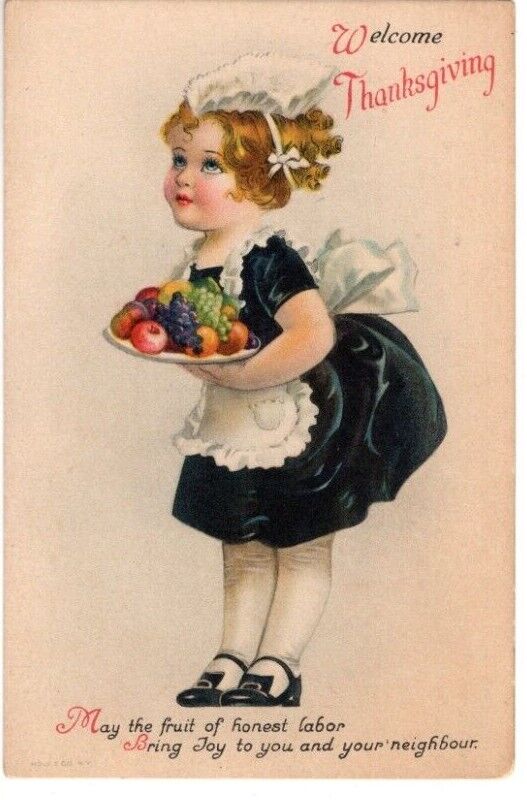ANTIQUE THANKSGIVING Postcard YOUNG GIRL DRESSED AS MAID HOLDING TRAY