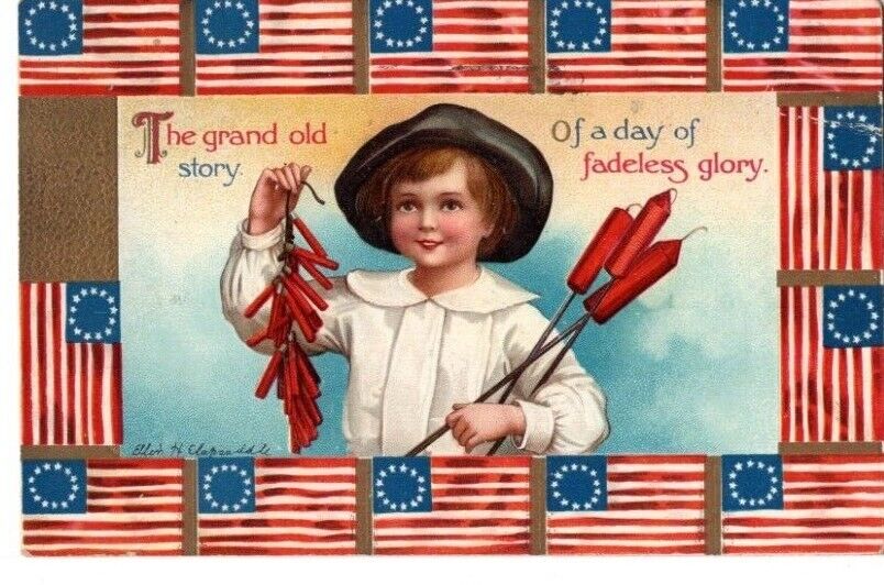 Title (ebay affiliate link): ANTIQUE PATRIOTIC Postcard ELLEN CLAPSADDLE CHILD HOLDING FIRECRACKERS