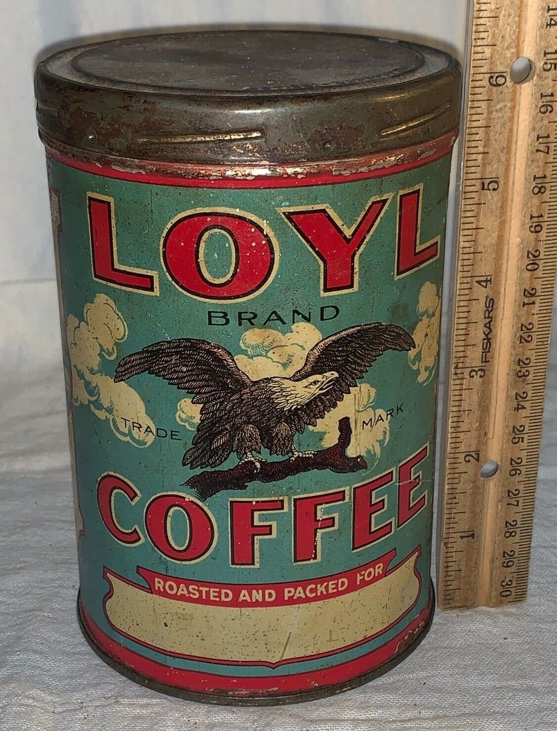 ANTIQUE LOYL COFFEE TIN LITHO 1 CAN PATRIOTIC AMERICAN BALD EAGLE COUNTRY STORE
