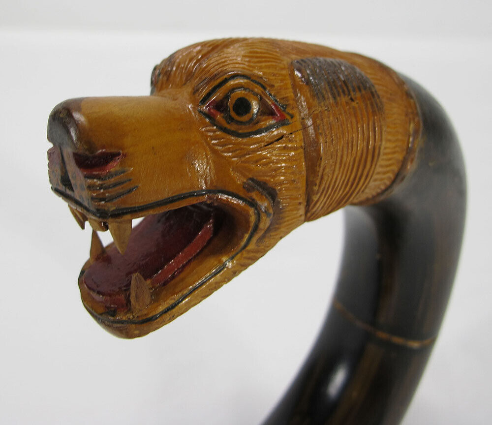 Antique 19th C Walking Stick Cane Snarling Dog Primitive Folk Art Carved End yqz
