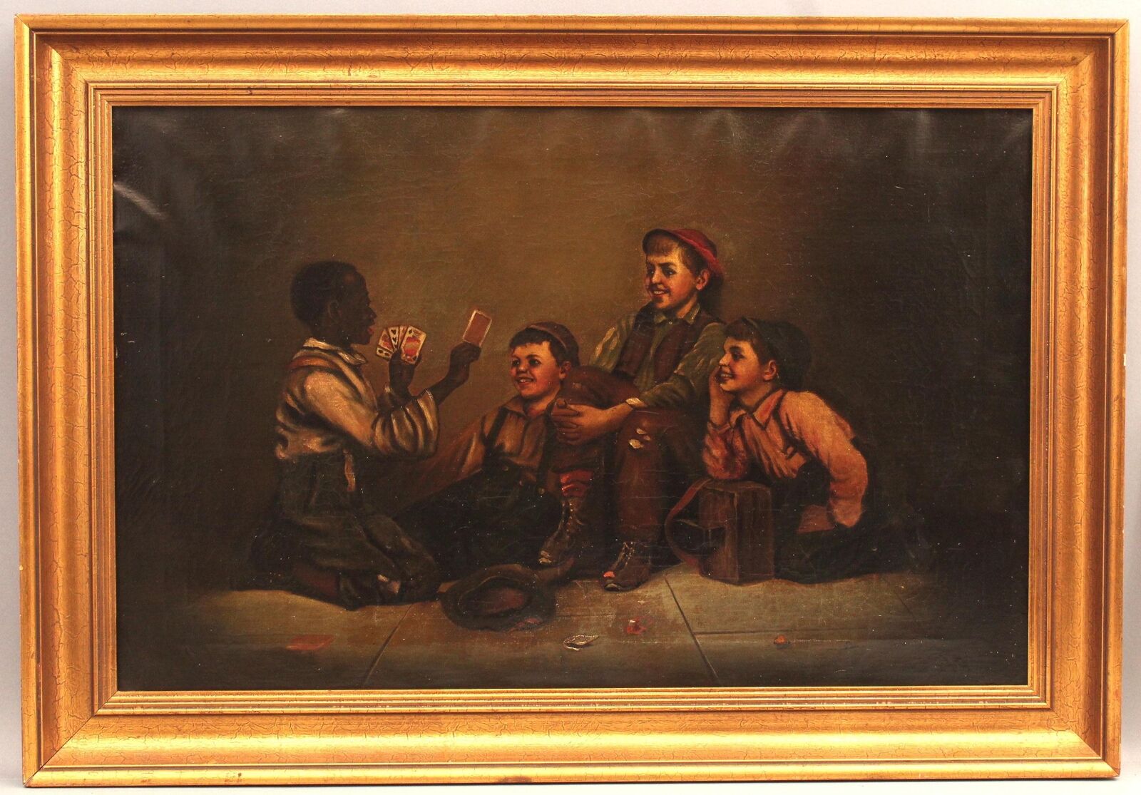 Antique Black Americana Genre Oil Painting Playing CARD TRICK after J.G. Brown