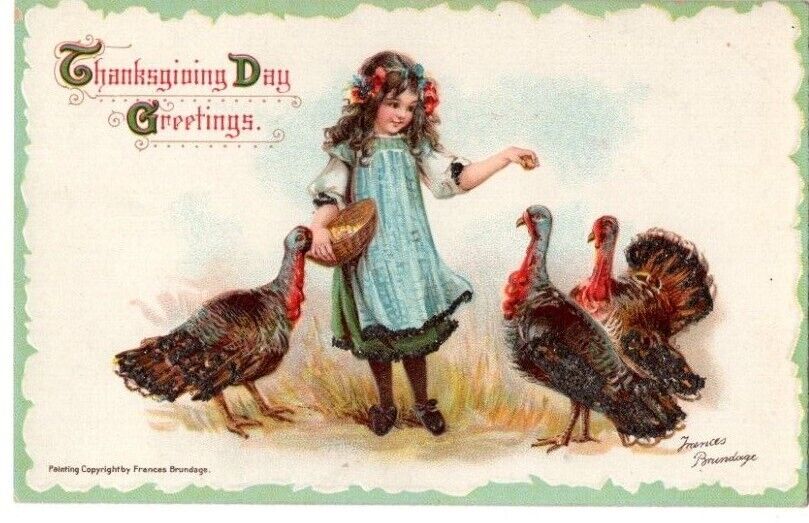 Title (ebay affiliate link): ANTIQUE EMBOSSED THANKSGIVING Postcard FRANCES BRUNDAGE YOUNG GIRL TURKEYS