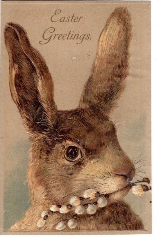 Title (ebay affiliate link): ANTIQUE EMBOSSED EASTER Postcard CLOSEUP OF BUNNY WITH PUSSYWILLOW IN ITS MOUTH