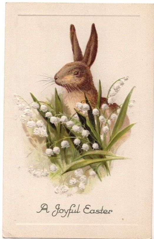 Title (ebay affiliate link): ANTIQUE EMBOSSED EASTER Postcard BUNNY IN LILIES OF THE VALLEY