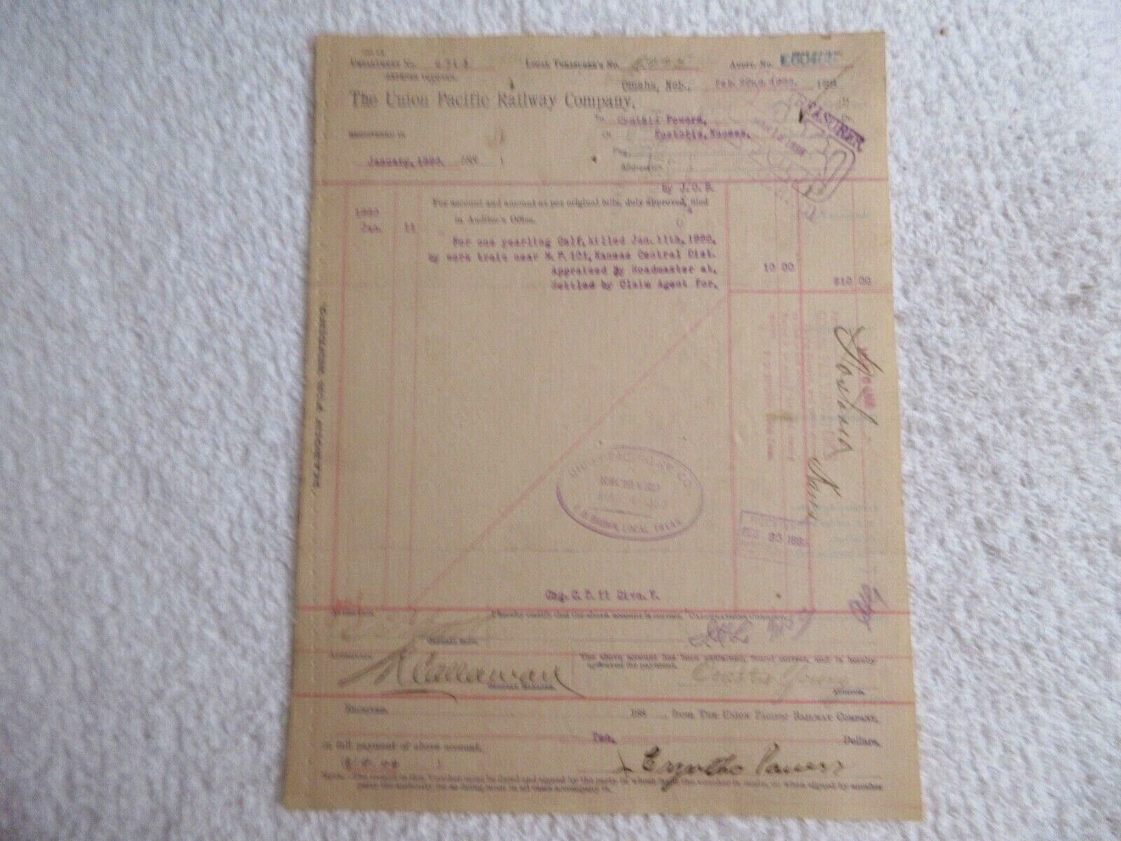 antique 1886 Union Pacific Railway Co. Insurance claim for killed calf lot B