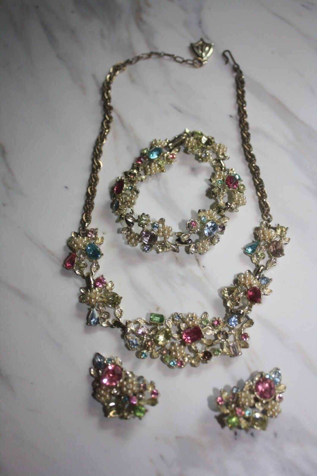 Title (ebay affiliate link): Vintage Extra Colorful Pastel Flower Jewelry Set Necklace Earrings Bracelet