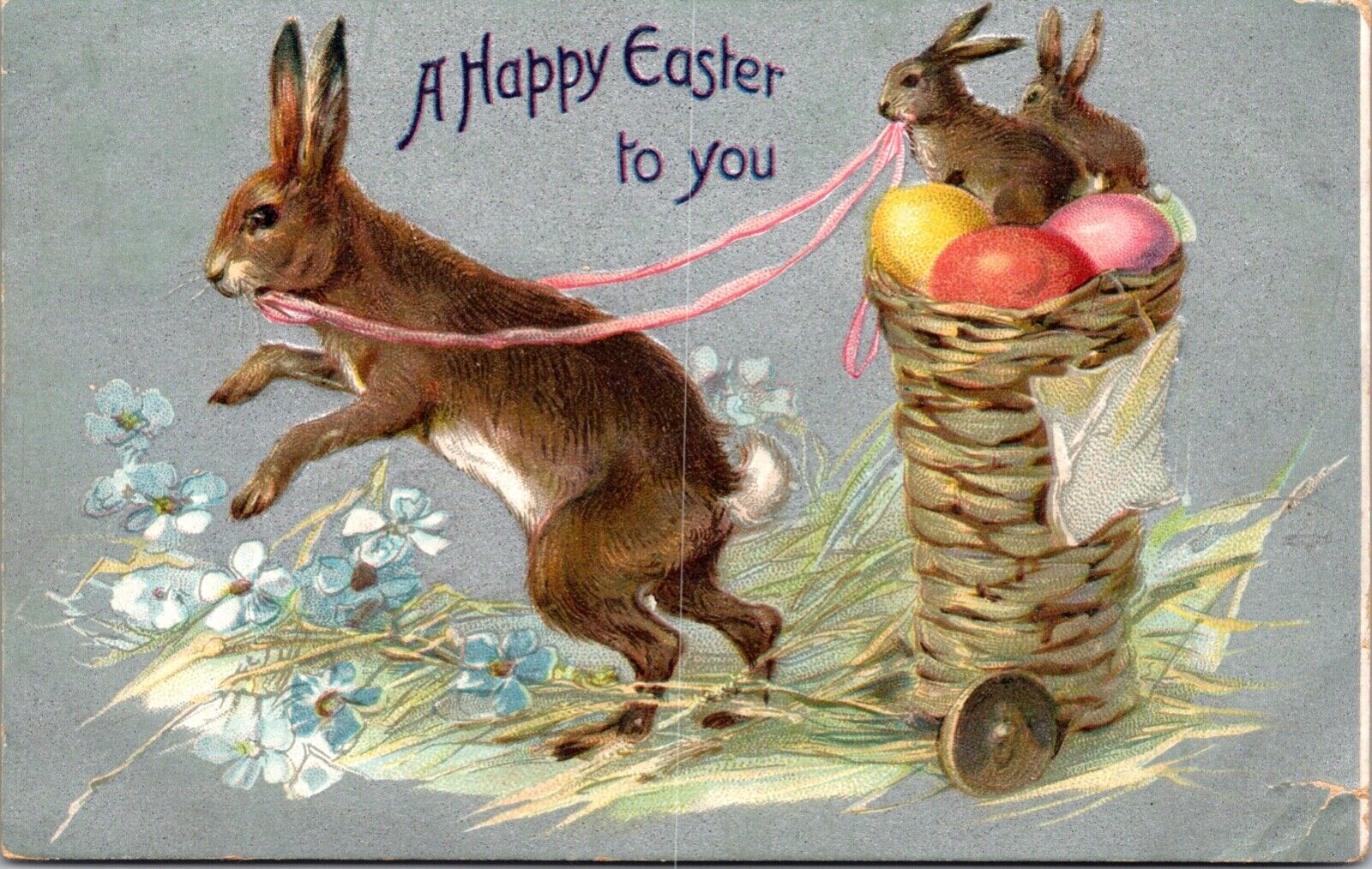 Title (ebay affiliate link): ANTIQUE EMBOSSED EASTER Postcard BUNNIES PUSHING AND PULLING EGG PUSSYWILLOWS