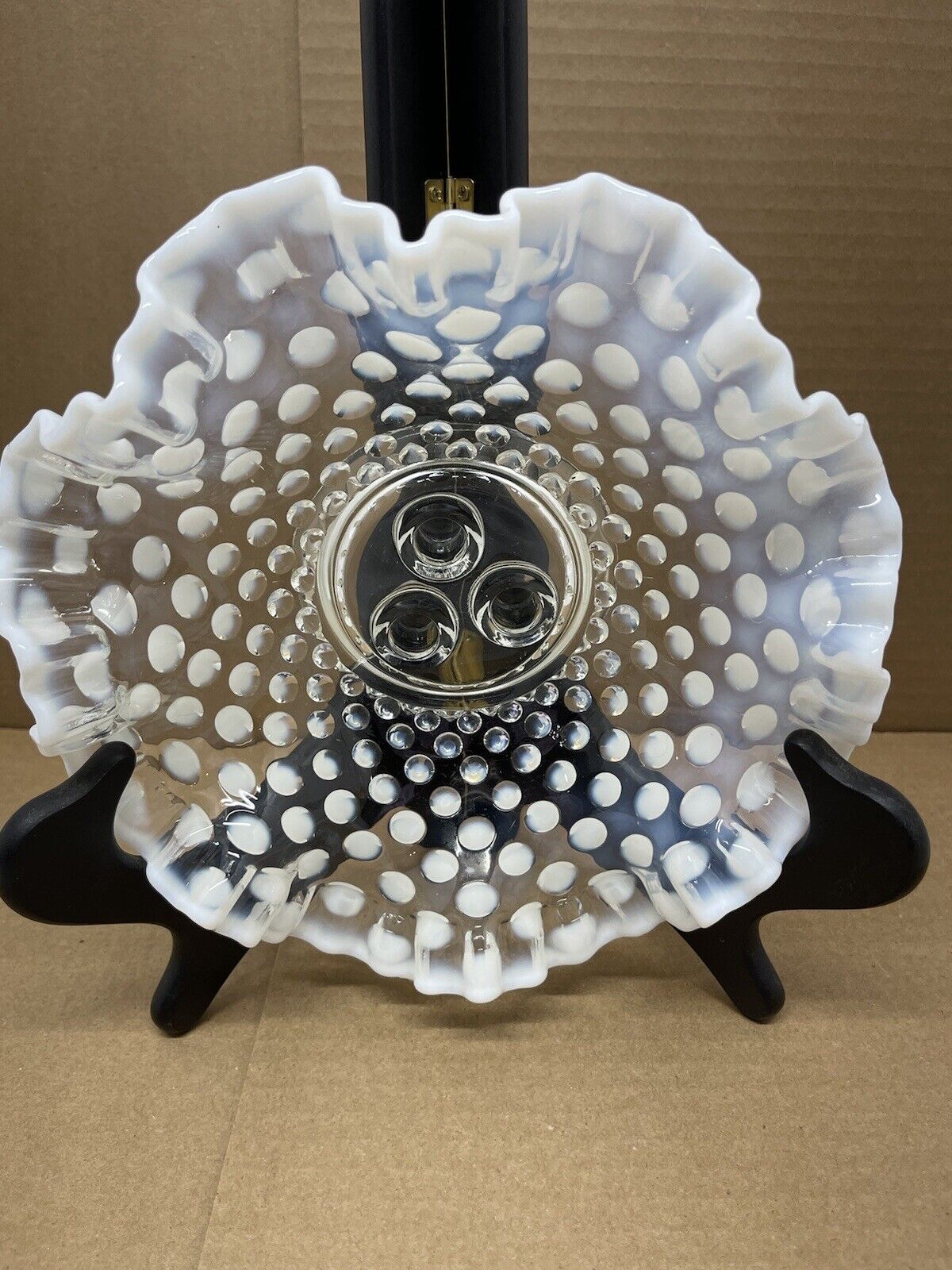 Vintage Fenton White Hobnail 3 Horn Trumpet Vase Empergne Bowl