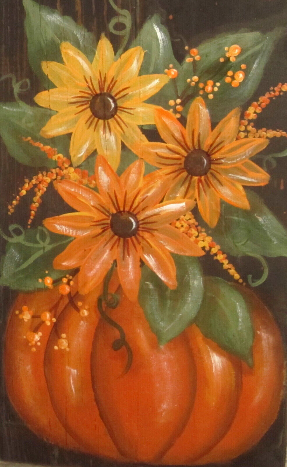 Title (ebay affiliate link): PRIMITIVE HP FOLK ART PRIM PUMPKIN FALL SUNFLOWERS RECLAIMED WOOD