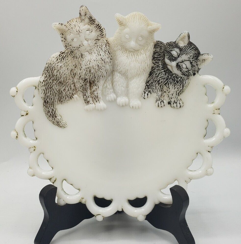 Title (ebay affiliate link): Vtg 734 White Milk Glass Westmoreland Plate Raised 3 Cats Kittens Pierced Edge
