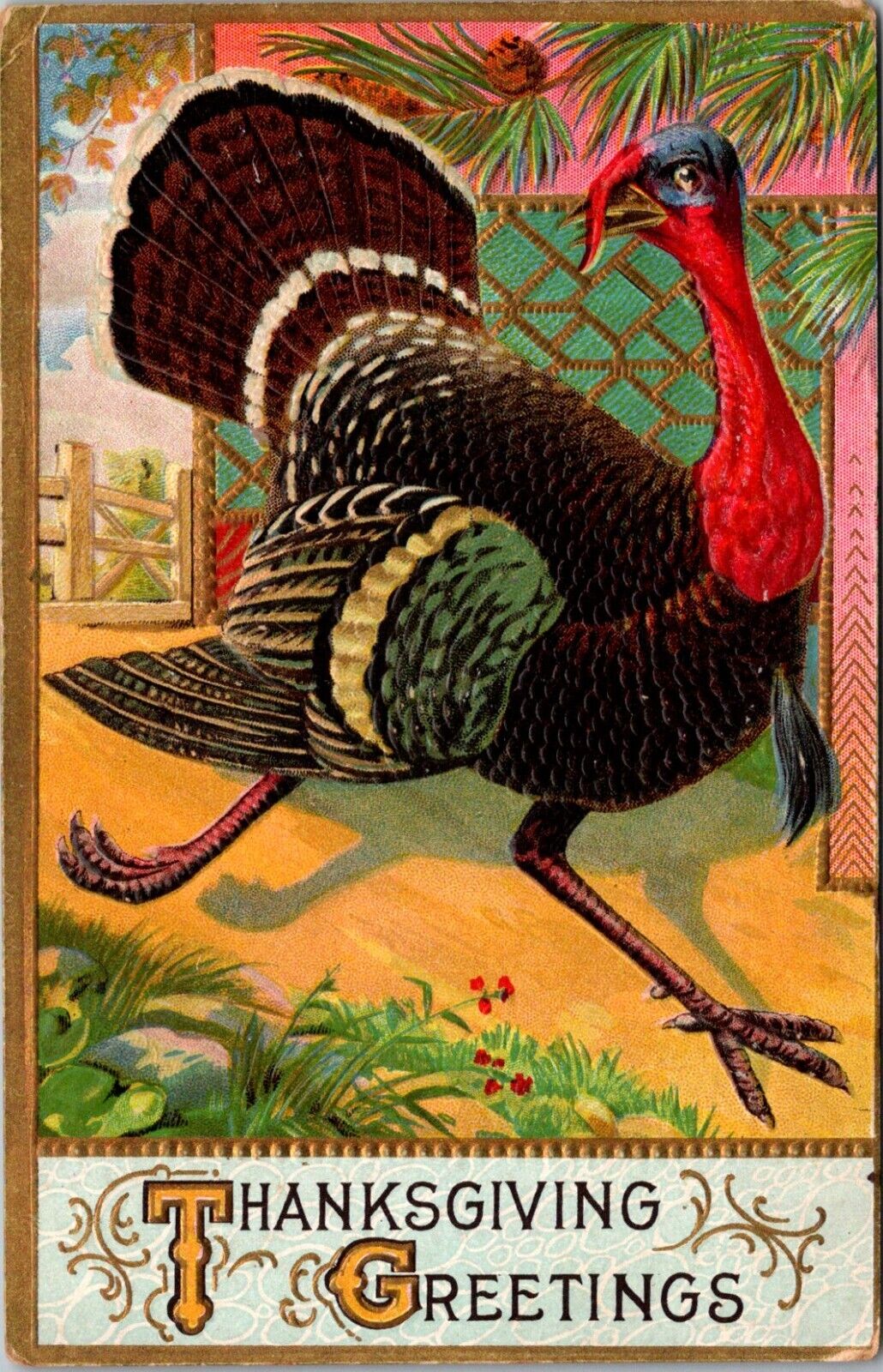 ANTIQUE THANKSGIVING Postcard ELLEN CLAPSADDLE PILGRIM BOY HOLDING TURKEY