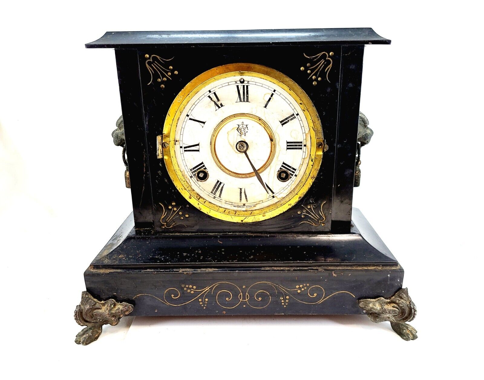 S244 Antique Ansonia Clock Co. Black Brass Trim Victorian Boulle Mantel Clock
