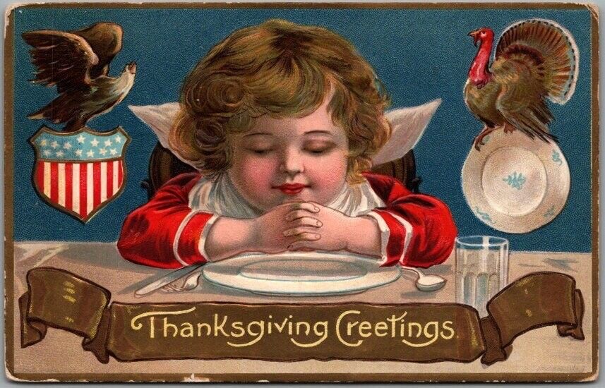 ANTIQUE EMBOSSED THANKSGIVING Postcard CHILD AT TABLE PRAYING HANDS EAGLE