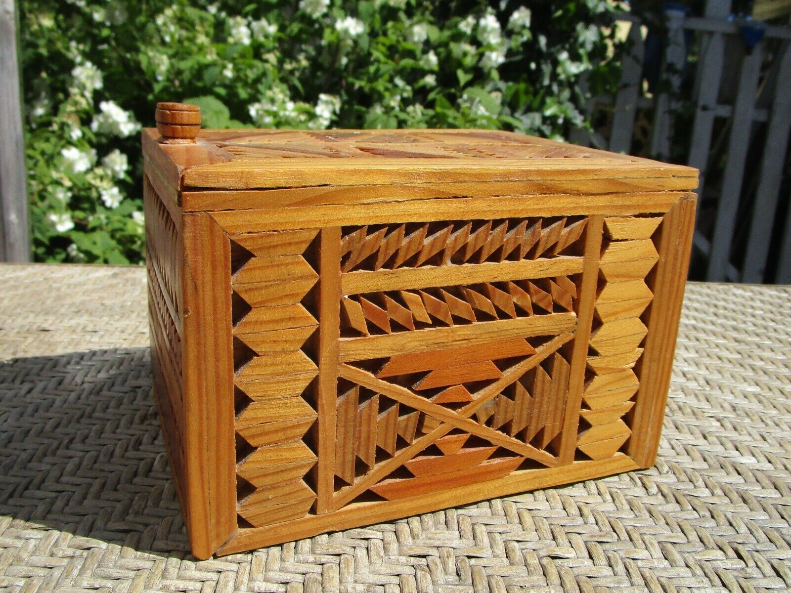 Title (ebay affiliate link): Vintage Ornate Inlaid 8 Sided Folk Art Trinket Box Humidor Birds Eye Maple yqz