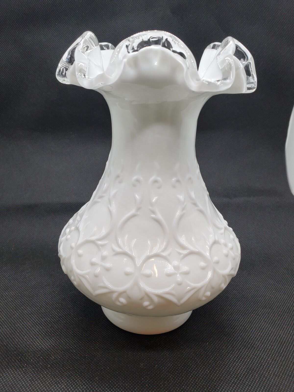 Fenton White Spanish Lace Milk Glass Silver Crest Ruffled Top Vase 7 1/234