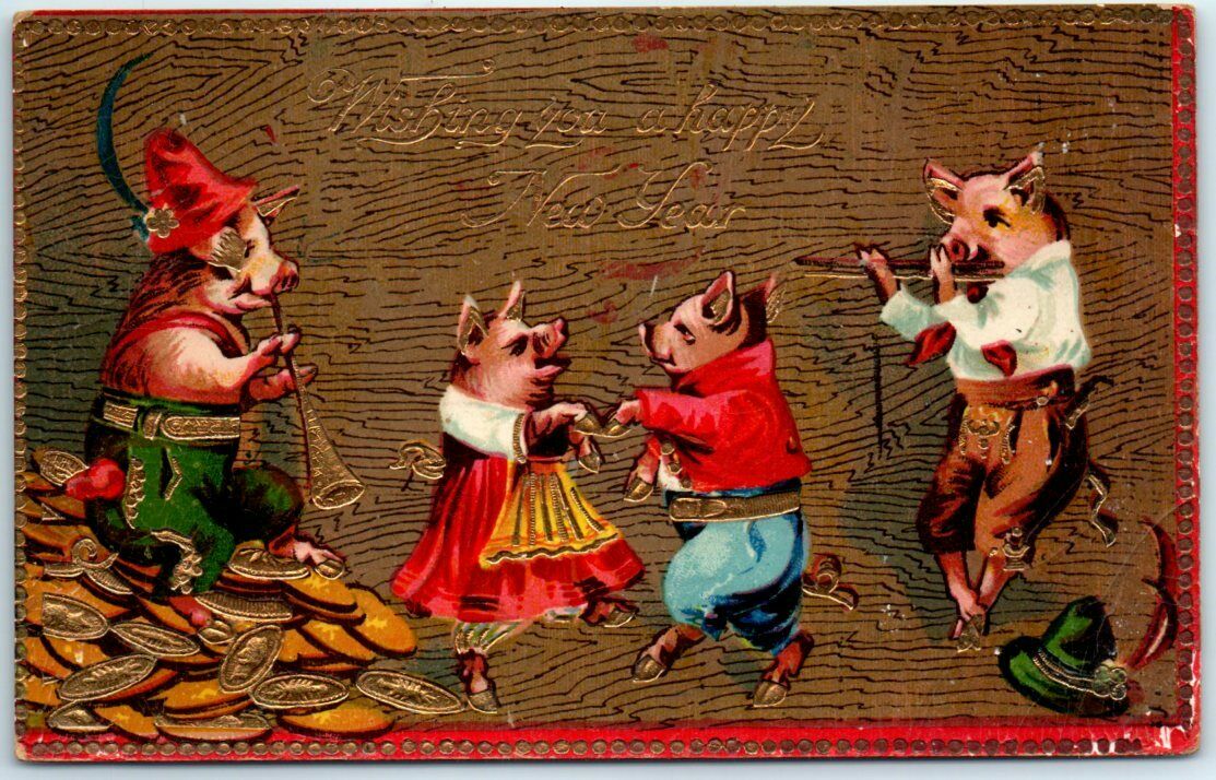 ANTIQUE EMBOSSED NEW YEAR Postcard BOYS WAVING COUPLE IN AUTO PUPPY RUNNING