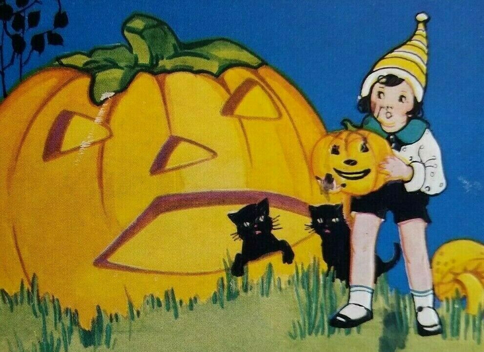 Title (ebay affiliate link): ANTIQUE EMBOSSED HALLOWEEN Postcard CHILDREN BITING APPLE BLACK CAT PUMPKIN