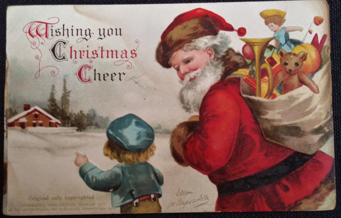 Antique Christmas postcard c1907 UDB A/S Clapsaddle Santa walking with child