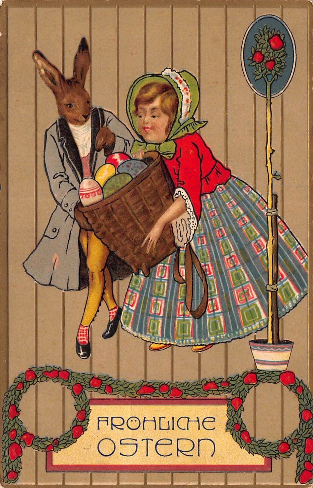 GERMAN ANTIQUE EASTER Postcard LAMB CARRYING BASKET OF COLORED EGGS ON BACK