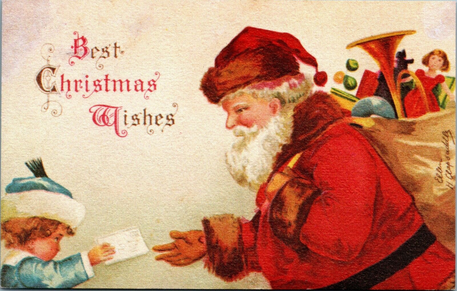 Antique Christmas postcard c1908 A/S Clapsaddle Santa getting letter from girl