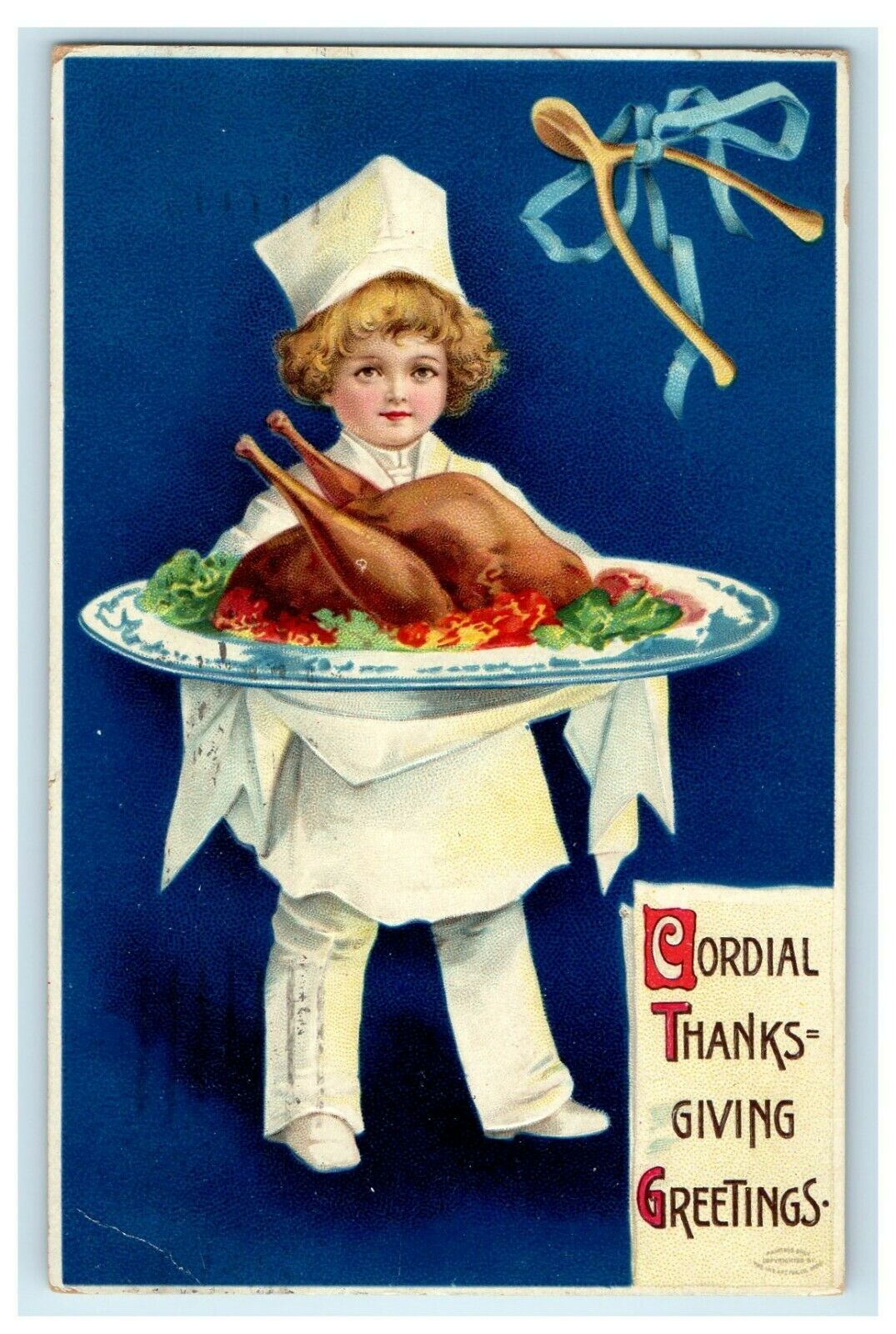 ANTIQUE THANKSGIVING Postcard ELLEN CLAPSADDLE TURKEY RIBBON ON WISHBONE