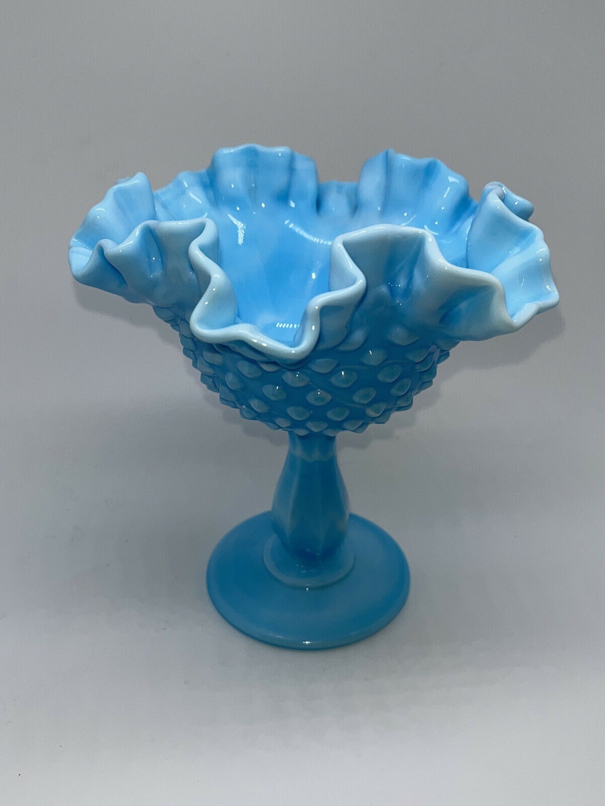 Vintage Fenton Cased Blue White Hobnail Milk Glass Ruffled Edge Bowl Candy Dish