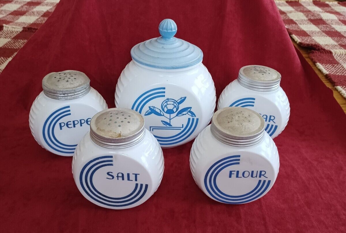 5 Pc Vtg Art Deco Shakers White Blue Milk Glass Shaker Set Pepper Flour Sugar