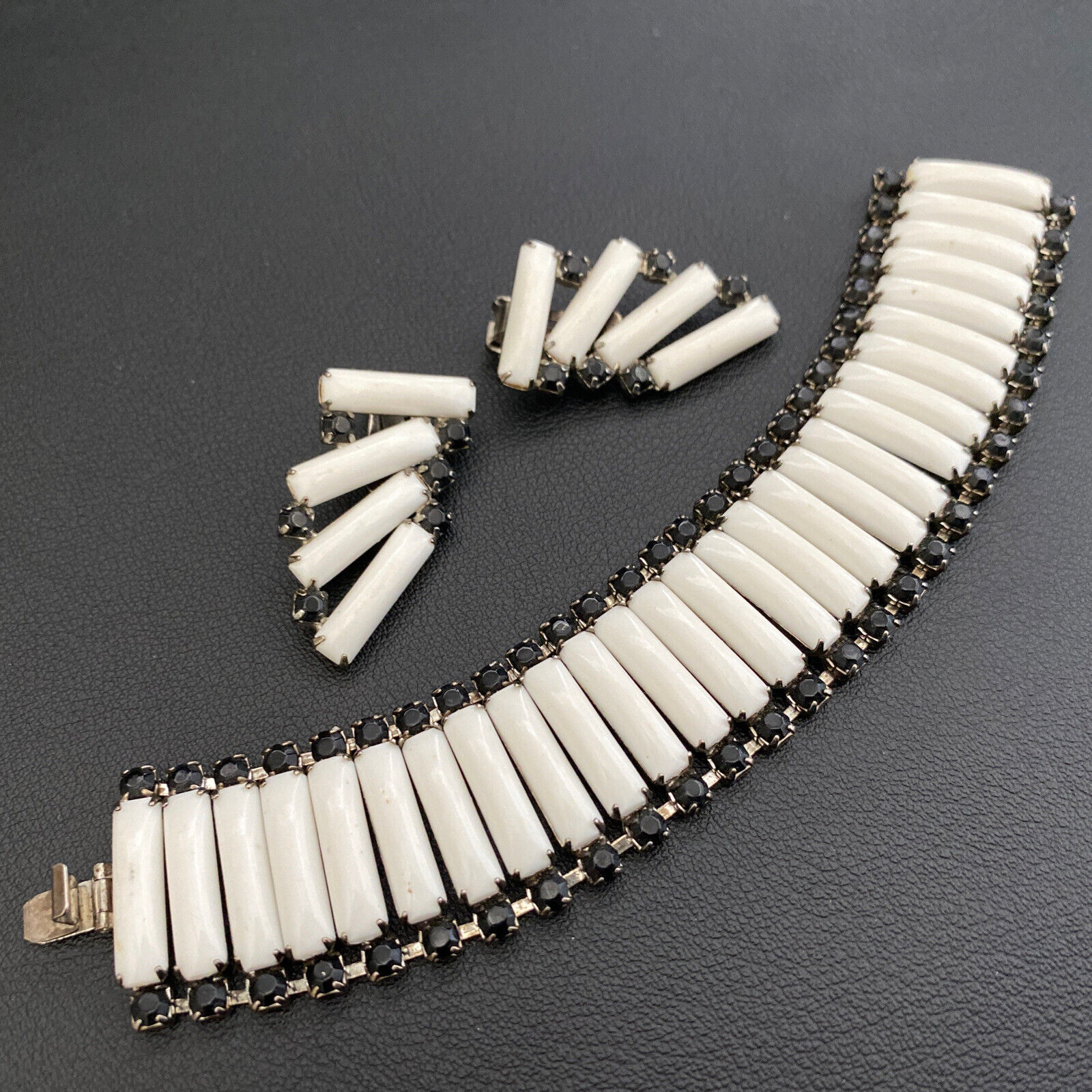Title (ebay affiliate link): Vintage Set Bracelet Earrings Rhinestone Milk White Glass Unique Style P24
