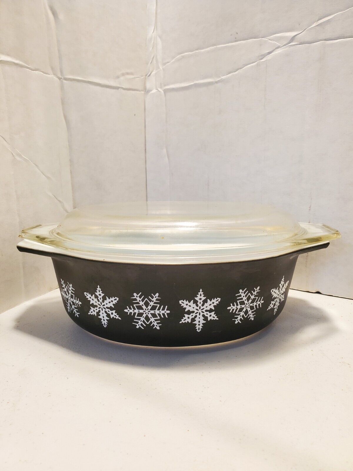 Title (ebay affiliate link): Vintage Pyrex Black Snowflake 575B Space Saver Casserole Dish 2Quart with Lid
