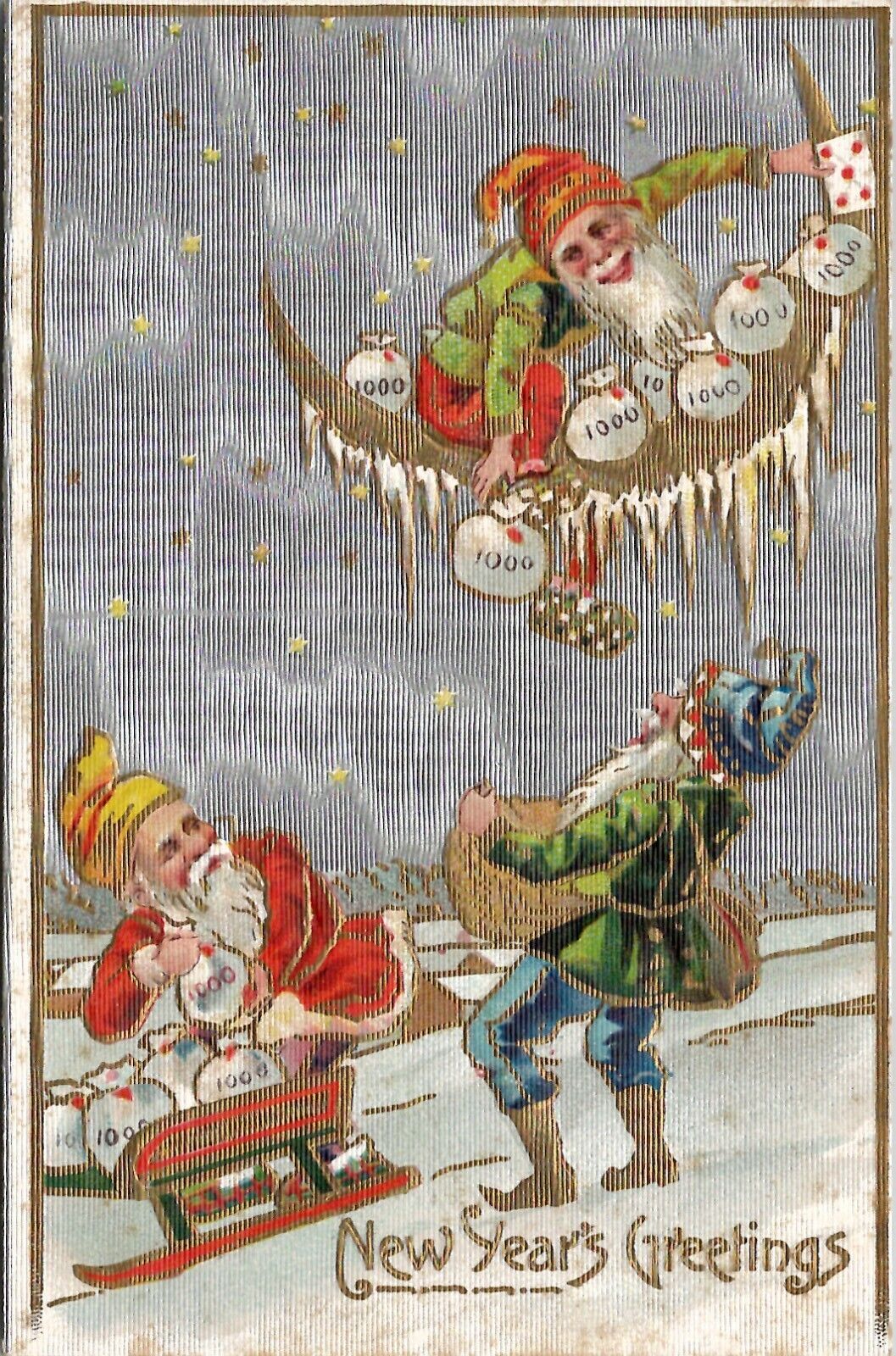 ANTIQUE EMBOSSED NEW YEAR Postcard GNOME DROPPING BAGS OF MONEY OFF MOON