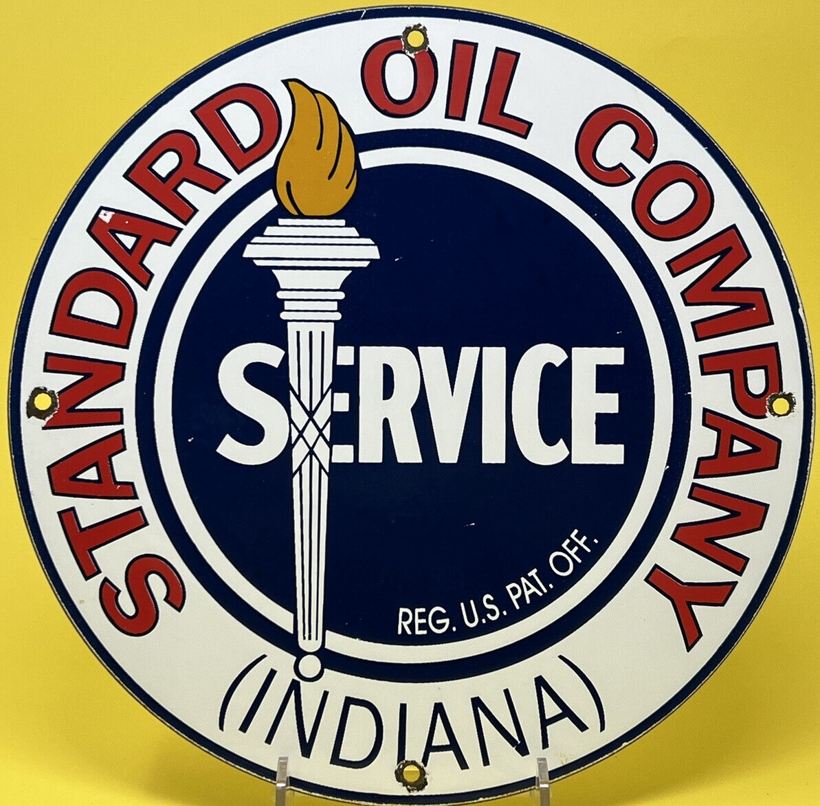 VINTAGE 1954 DATED STANDARD GASOLINE INDIANA 12”PORCELAIN TORCH GAS OIL SIGN