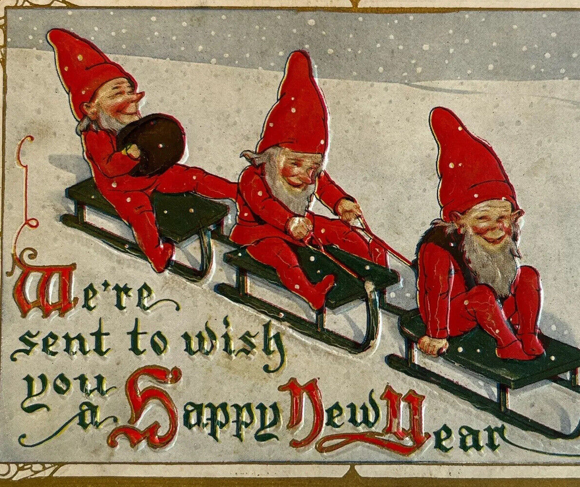 ANTIQUE EMBOSSED NEW YEAR Postcard THREE GNOMES IN SNOW SUNGLASSES BOWING