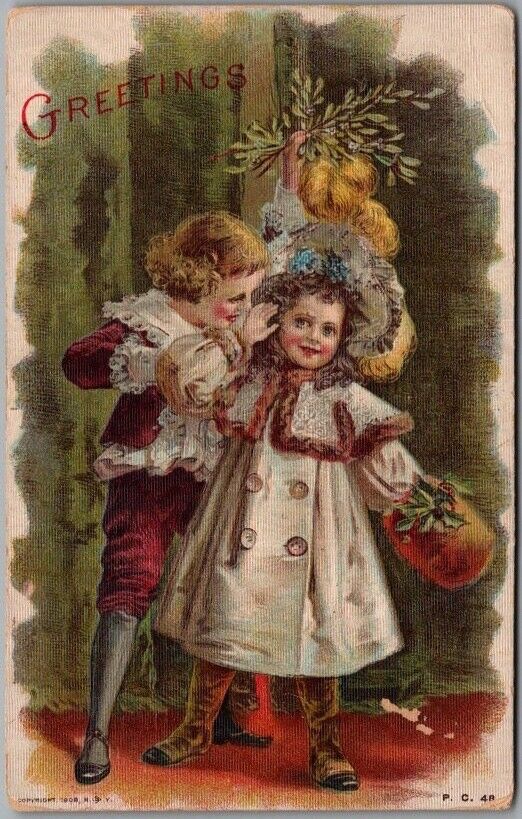 ANTIQUE EMBOSSED NEW YEAR Postcard BOY AND GIRL MISTLETOE POINSETTIA
