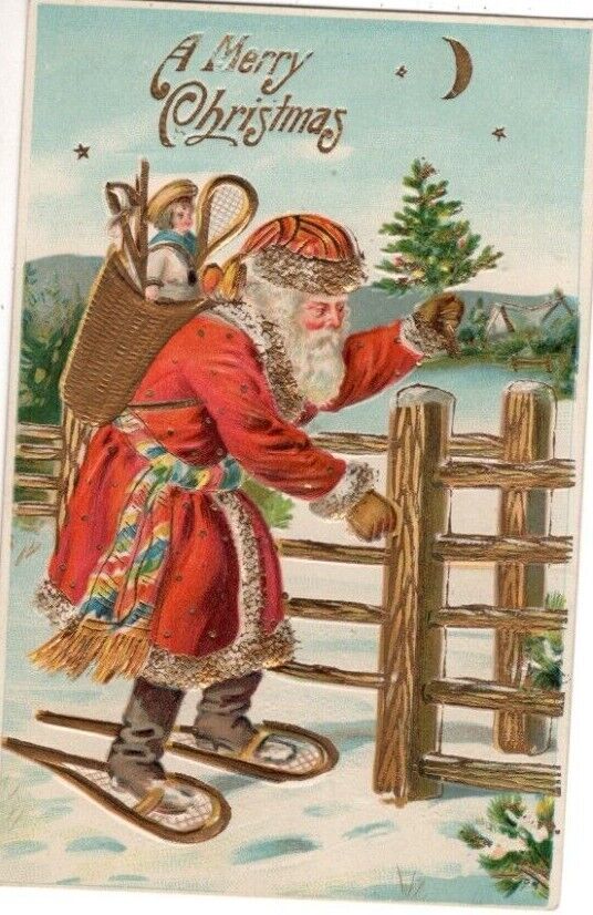 Title (ebay affiliate link): ANTIQUE CHRISTMAS Postcard SANTA CLAUS SNOWSHOES COLORFUL SASH GATE