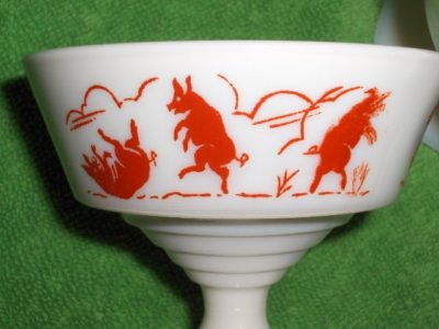 2 Hazel Atlas Red Dancing Pigs Sherbet Milk Glass old