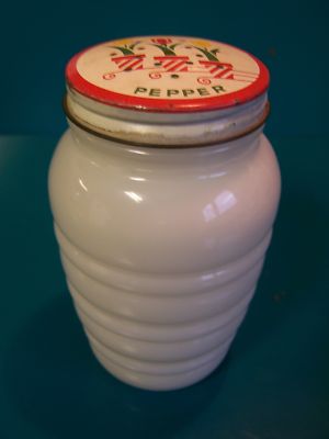 VINTAGE HOCKING MILK GLASS PEPPER SHAKER WITH TULIP LID