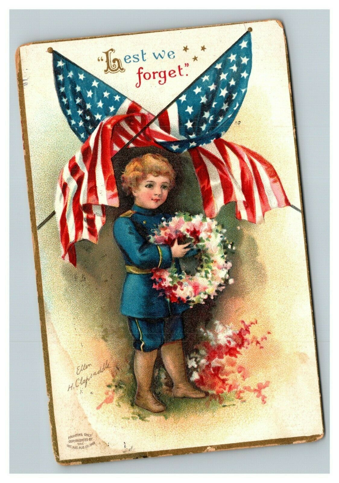 ANTIQUE PATRIOTIC Postcard ELLEN CLAPSADDLE CHILD AMERICAN FLAG WREATH