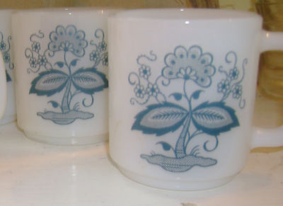 2 Glasbake Blue Onion Milk Glass Coffee Cups/Mugs