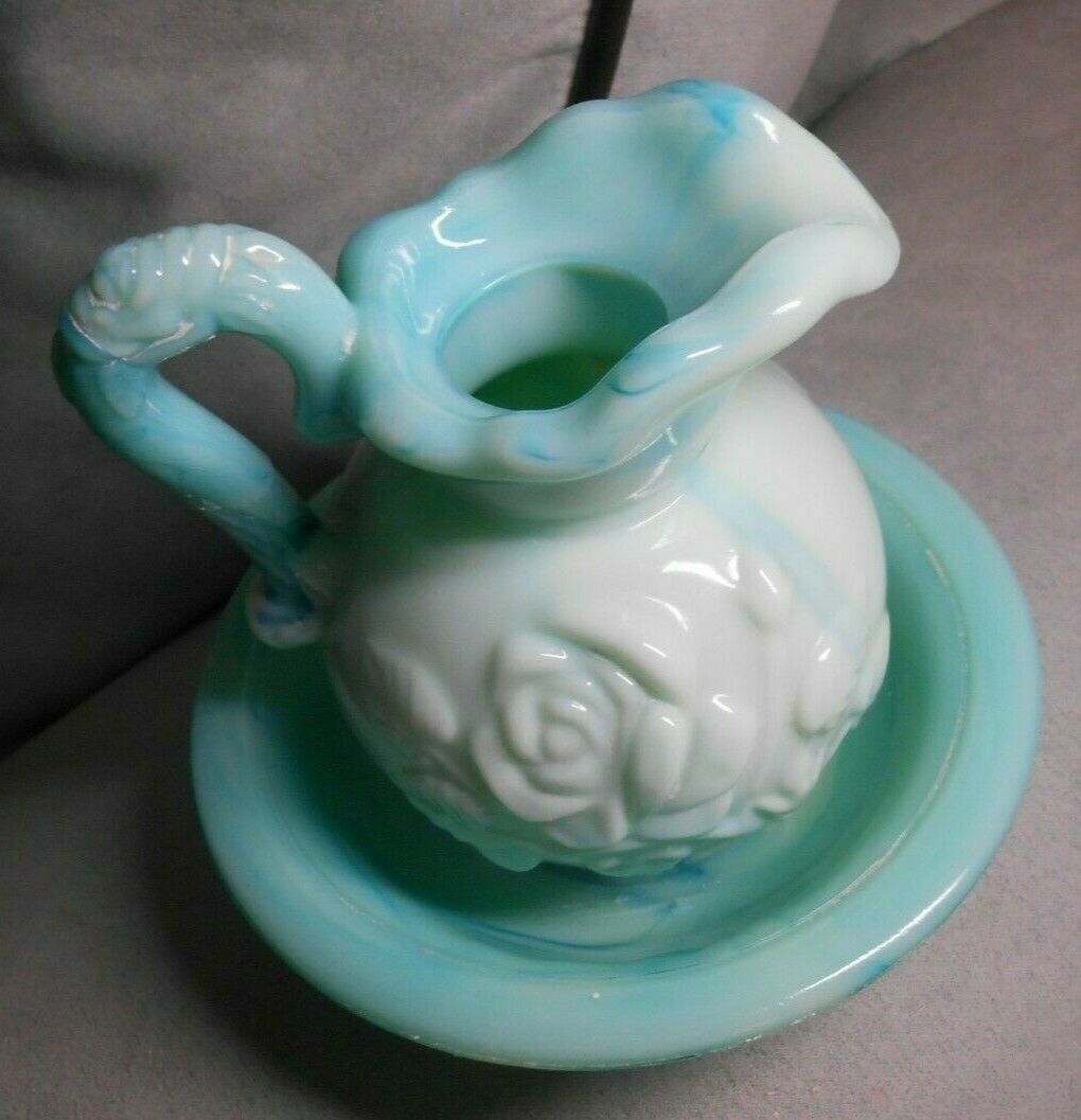 Vintage Avon Jadeite Green Swirl Milk Glass Rose Mini Bowl and Pitcher Set 1976