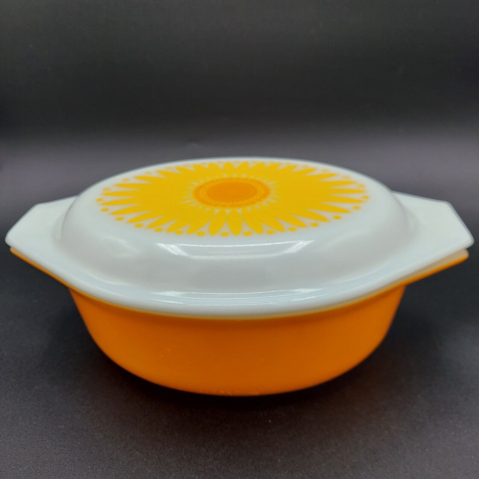 Title (ebay affiliate link): Vintage Pyrex 043 1.5 Qt Oval Orange Casserole Dish with Daisy/Sunflower Lid