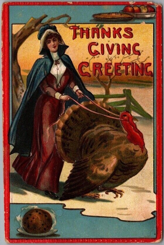 ANTIQUE EMBOSSED THANKSGIVING Postcard YOUNG PILGRIM LADY TRIMMING PIE CRUST