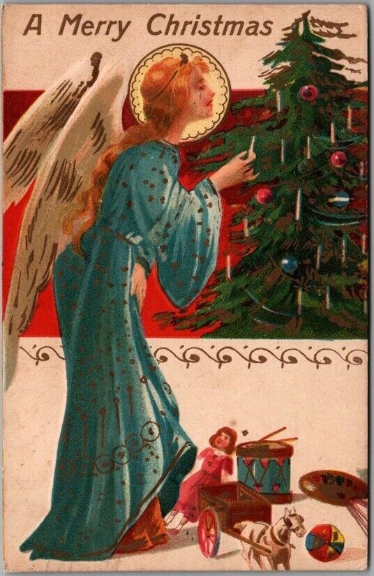 Title (ebay affiliate link): ANTIQUE EMBOSSED CHRISTMAS Postcard ANGEL IN AIR HOLDING XMAS TREE STAR ON TOP