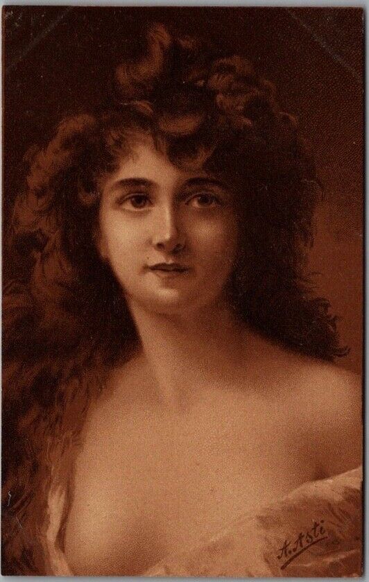 ANTIQUE ARTIST SIGNED Postcard PROFILE OF PRETTY YOUNG LADY YELLOW DRESS