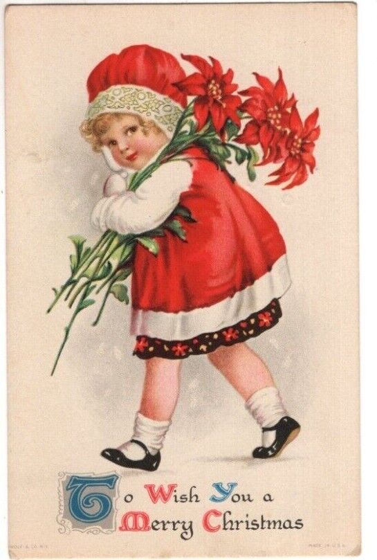 Title (ebay affiliate link): ANTIQUE CHRISTMAS Postcard YOUNG GIRL IN RED HOLDING POINSETTIAS