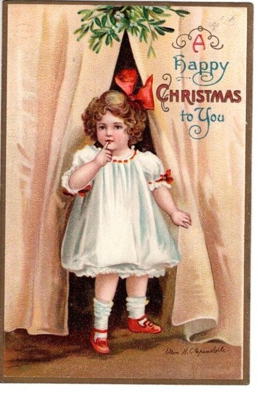 Title (ebay affiliate link): ANTIQUE CHRISTMAS Postcard ELLEN CLAPSADDLE YOUNG GIRL FINGER TO HER LIPS