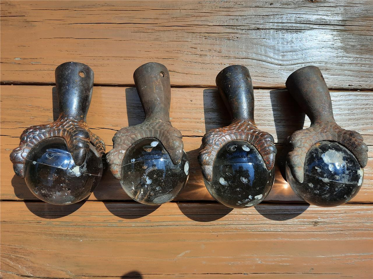 LARGE 634 ANTIQUE VINTAGE CAST IRON GLASS BALL EAGLE CLAW TALONS FEET SET OF 4