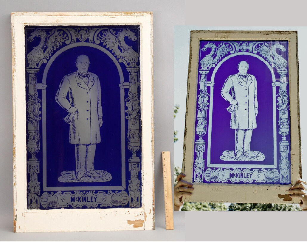 Title (ebay affiliate link): RARE Antique 19thC Cameo Cut Blue Glass Overlay Window President McKinley