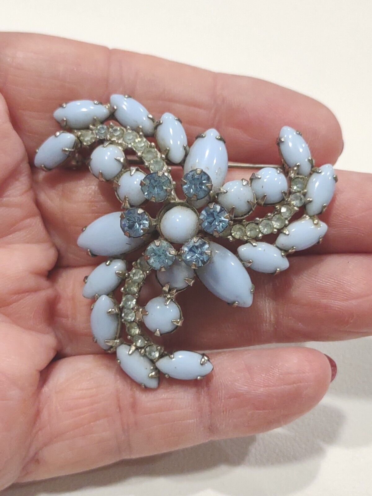Title (ebay affiliate link): Vintage Silver Tone Blue Milk Glass Rhinestone Brooch Pin Jewelry F25