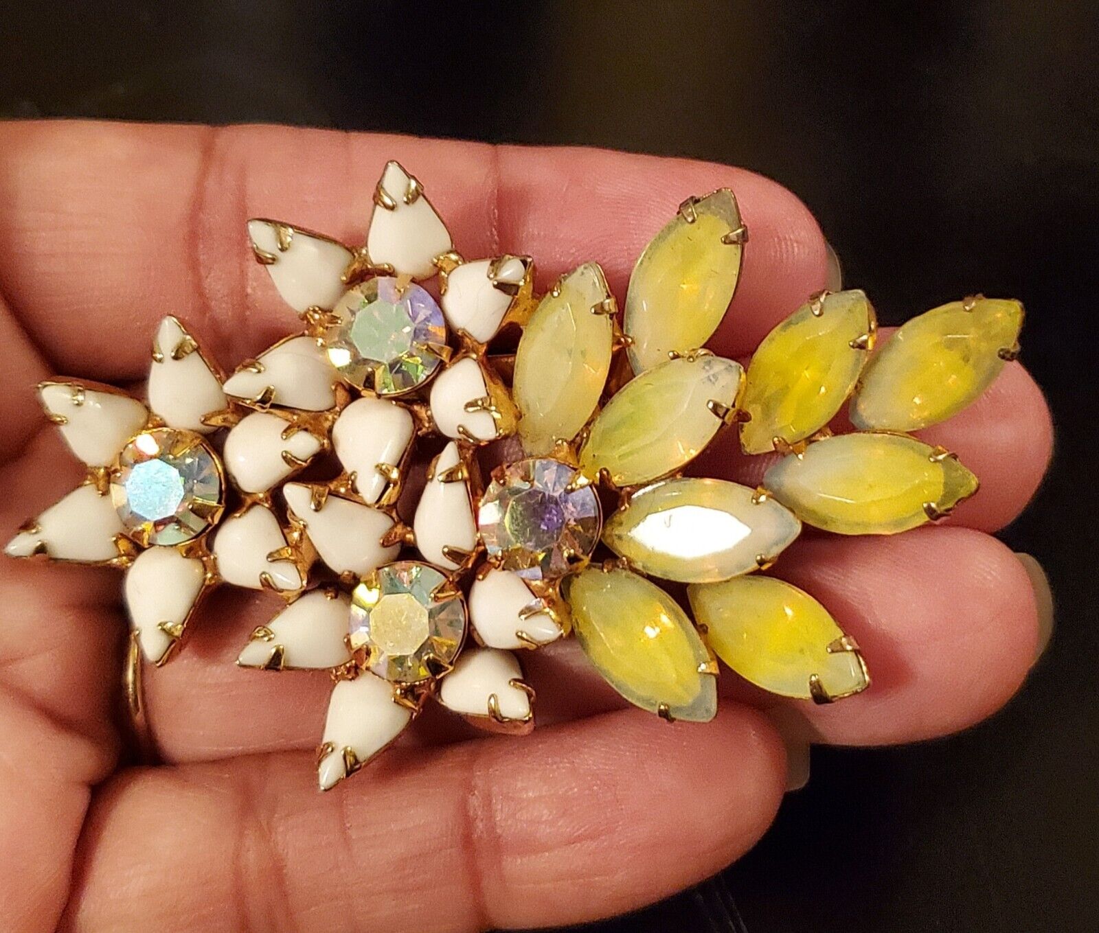 Gorgeous Vintage White Milk Glass Stones Yellow Rhinestones Brooch Gold Tone