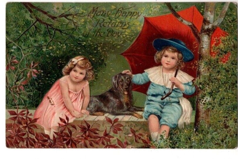 ANTIQUE EMBOSSED BIRTHDAY Postcard TWO YOUNG GIRLS SITTING ON LEDGE WITH PUPPY